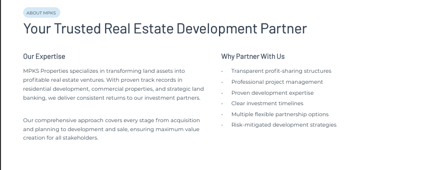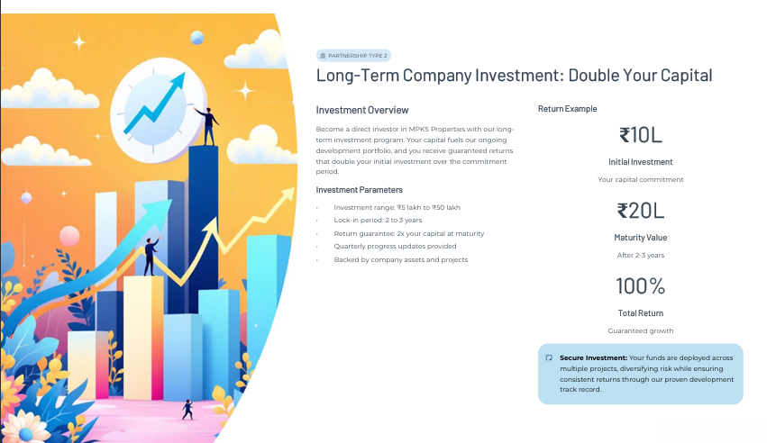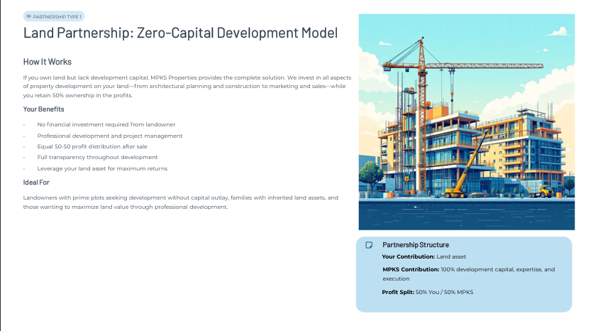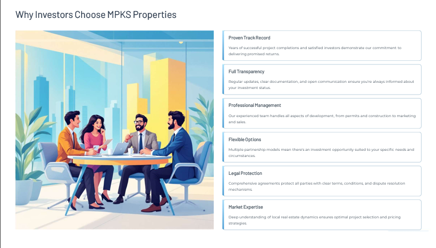 At MPKS PROPERTIES, we believe growth comes from working together. We welcome collaborations with investors, developers, and organizations who share our vision of building a premium, trustworthy real estate ecosystem. Whether it’s joint ventures, co-branded projects, or innovative partnerships!